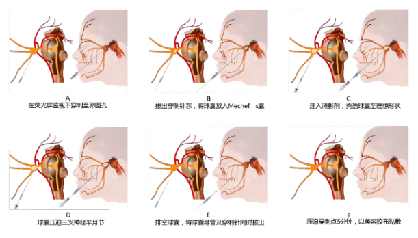 简单讲就是从患侧口角旁穿刺,通过一个鞘管在X线透视监视下,将一个微球囊导入Mecke's腔的三叉神经的半月节,然后缓慢注入对比造影剂充盈球囊,把导致面神经痛的神经纤维解除卡压,并通过扩张的球囊压迫破坏,较后退出球囊,伤口压迫止血。